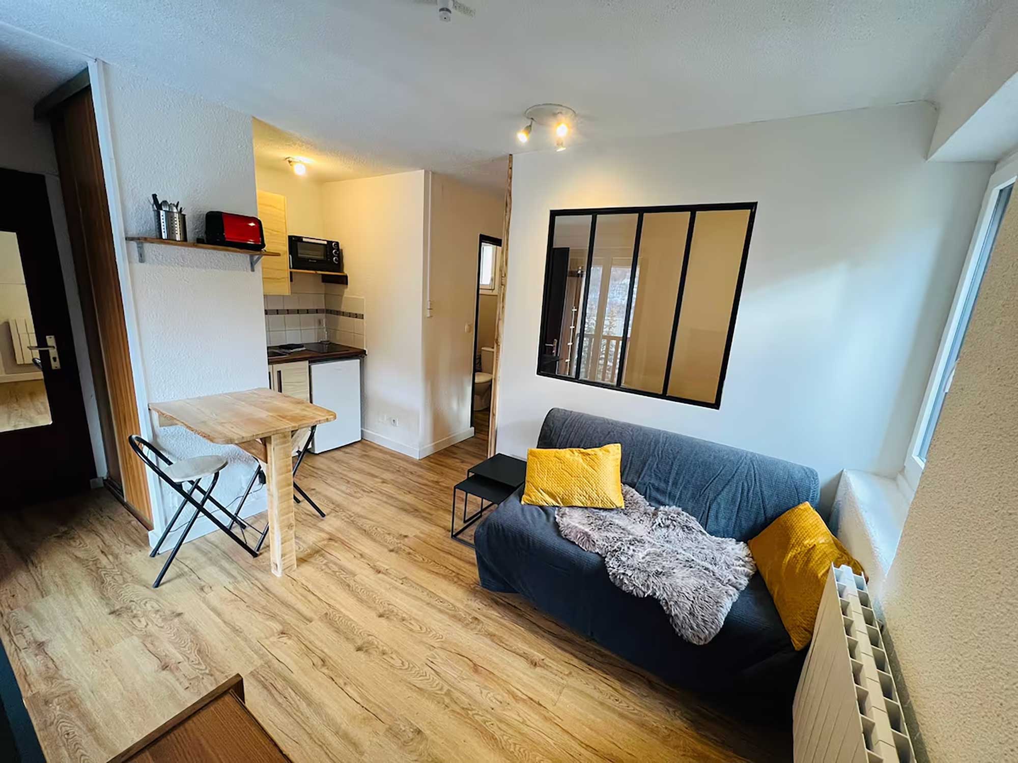Le studio dispose d’un coin nuit séparé par une verrière, d’une kitchenette fonctionnelle et d’un balcon ensoleillé de 6 m² pour admirer la vue.